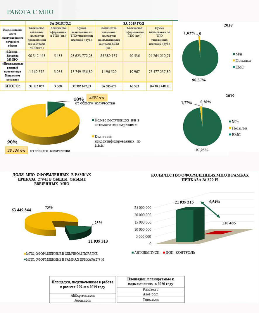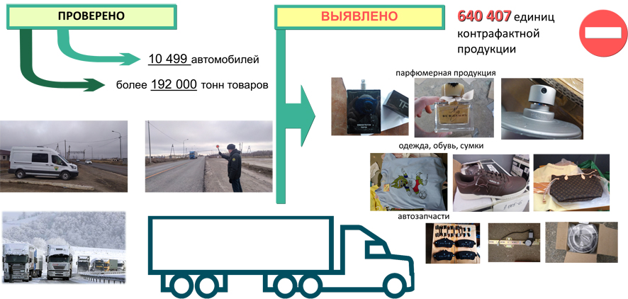 За прошедший год проверено более 192 000 тонн товаров, что на 60% больше значения 2018 года, более чем в 2 раза выросло количество выявленных нарушений законодательства (2 185 случаев), выявлено 640 407 единиц товаров, обладающих признаками контрафактной продукции.