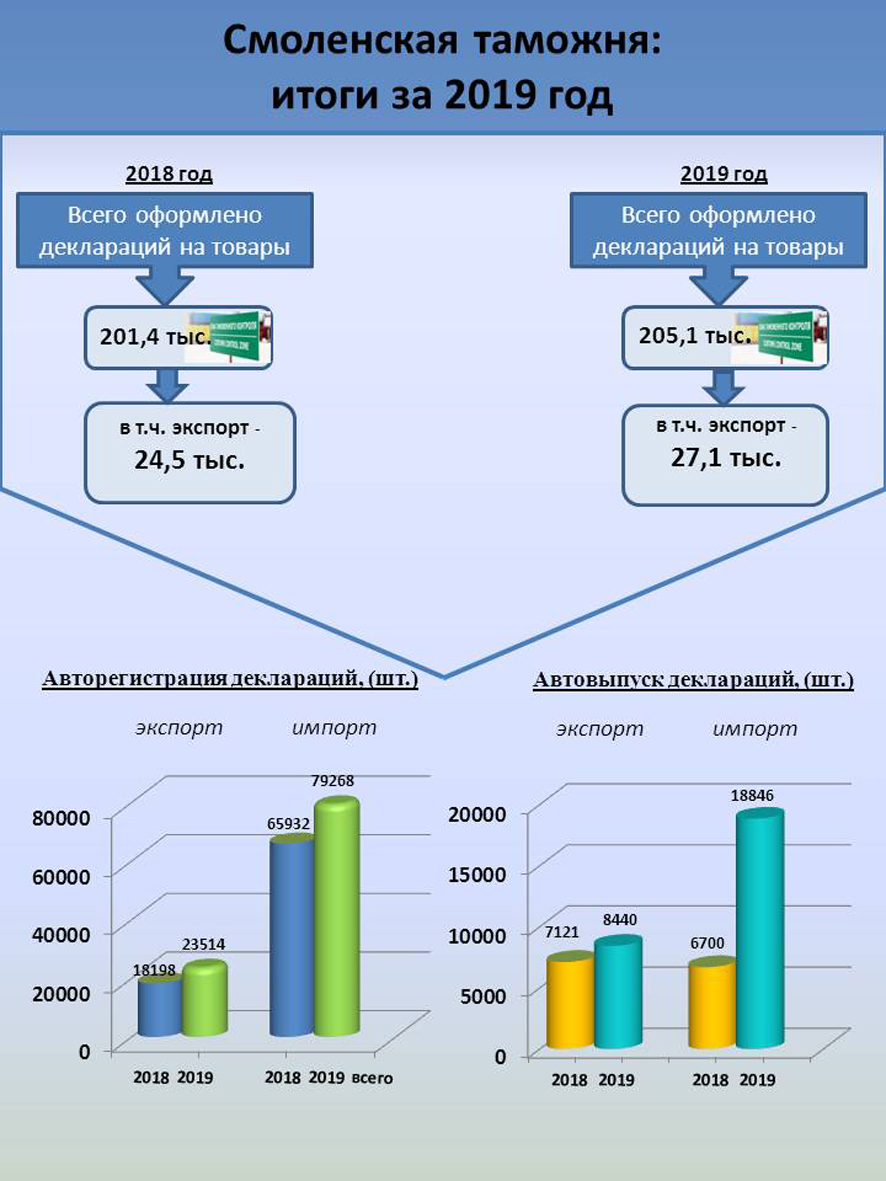 Таможенными постами Смоленской таможни за 2019 год оформлено 205,1 тыс. деклараций на товары (ДТ). Их число по сравнению с аналогичным периодом прошлого года выросло на 1,8%, в т.ч. количество экспортных деклараций - с 12,2% до 13,3%.