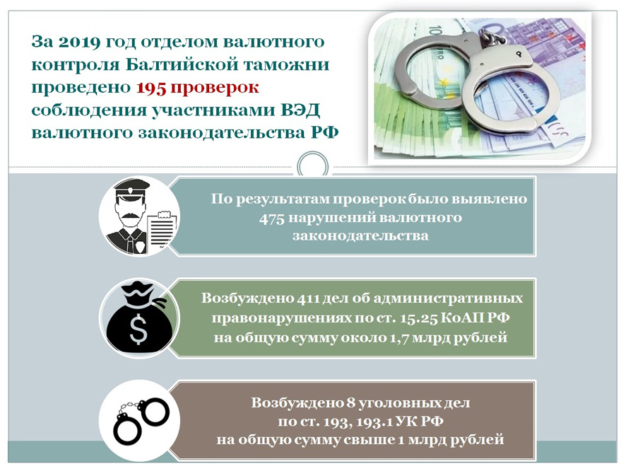 За 2019 год на основании проверочных мероприятий, проведенных отделом валютного контроля Балтийской таможни в отношении внешнеторговых контрактов, правоохранительными подразделениями Балтийской таможни возбуждено 8 уголовных дел по статьям 193, 193.1 Уголовного кодекса РФ (невозврат денежных средств из-за рубежа, вывод валютных средств на счета нерезидентов с использованием подложных документов) на общую сумму свыше 1 млрд рублей. Также по материалам отдела валютного контроля Балтийской таможни Северо-Западная оперативная таможня возбудила 4 уголовных дела по статьям 193, 193.1 УК РФ на общую сумму свыше 587 млн. рублей.