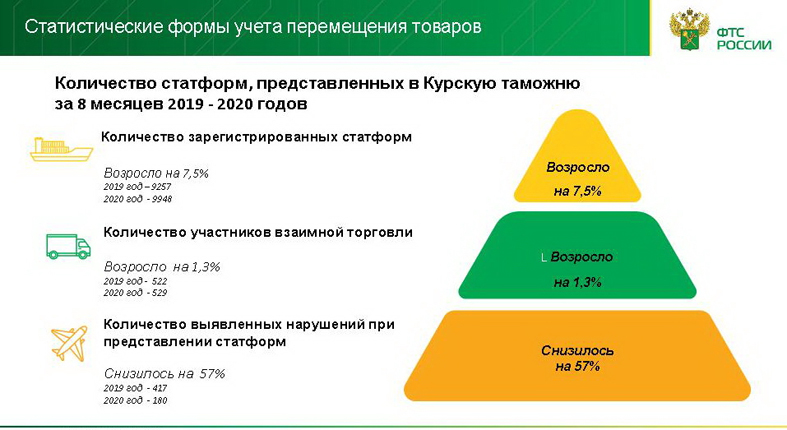 За восемь месяцев 2020 года количество статистических форм учета перемещения товаров, представляемых в таможенные органы курскими и орловскими участниками ВЭД, выросло на 7,5 %. При этом, количество дел об административных правонарушений, возбужденных по ст. 19.7.13 КоАП РФ (непредставление или несвоевременное представление в таможенный орган статистической формы учета перемещения товаров), снизилось на 57%.