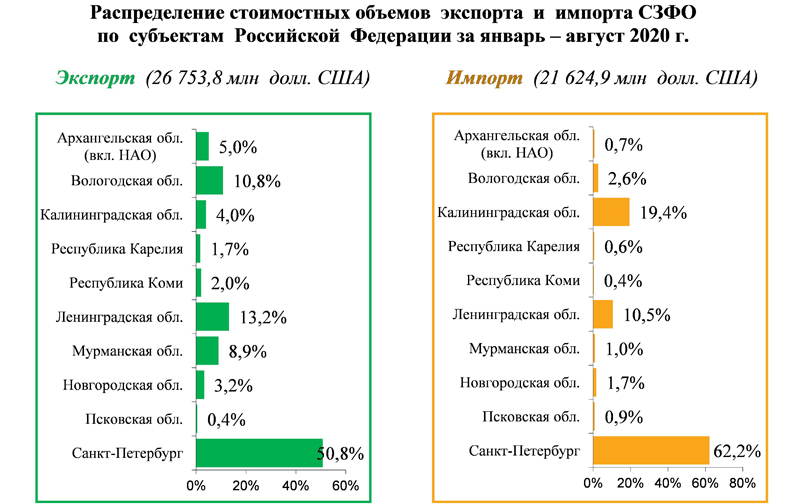 Внешнеторговый оборот составил 35,6 млрд долларов США, товарооборот - более 5,7 млн тонн. В товарной структуре экспорта преобладали металлы и изделия из них, машиностроительная продукция, продукция химической промышленности. В товарной структуре импорта - машиностроительная продукция, продукция химической промышленности, текстиль и текстильные изделия, продовольственные товары. В 2020 году на 10-15 % увеличился объемов декларирования оборудования и механических приспособлений, электрических машин, оптических приборов и аппаратов. Более чем на 20% увеличился объем декларирования изделий из черных металлов, продуктов неорганических химии, каучука и резиновых изделий. Лидерами по росту оформления стали товары 74 группы ТН ВЭД - медь и изделия из нее. На 10% сократилось оформление товаров 62 группы – предметов одежды и принадлежностей.