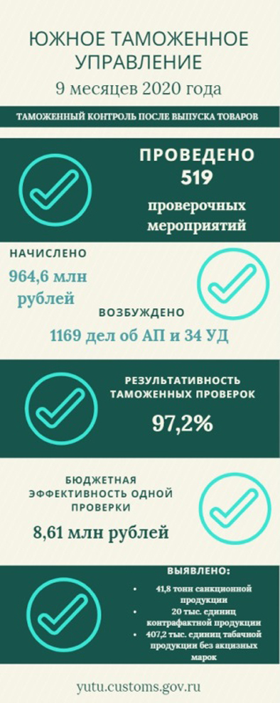 Количество нерезультативных проверок снизилось с 9 в прошлом году до 7 в 2020. Количество низкобюджетных проверок снизилось с 10 до 4. Помимо этого сократилось общее количество проведенных форм таможенного контроля после выпуска товаров с 240 в 2019 году до 215 в 2020. При этом уменьшилось число таможенных проверок – с 56 до 42.