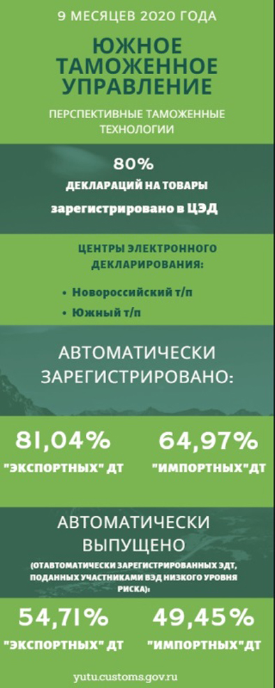 Более 97% деклараций были оформлены в Центре электронного декларирования Московской областной таможни. В полностью автоматическом режиме зарегистрировано 396 тыс. деклараций и выпущено почти 100 тыс. деклараций участников ВЭД низкого уровня риска.