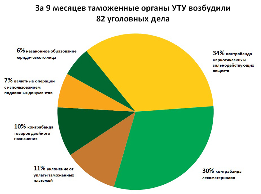 Возбуждено 3 уголовных дела по ст.226.1 УК РФ в связи с выявлением фактов контрабанды сильнодействующих веществ, 4 уголовных дела по ст. 173.2 УК РФ по факту незаконного использования документов для образования юридического лица, 1 уголовное дело по ст. 173.1 УК РФ незаконное образование и создание юридического лица, 1 уголовное дело по ст. 189 УК РФ незаконный экспорт товаров, материалов, которые могут быть использованы при создании оружия массового поражения, вооружения и военной техники.