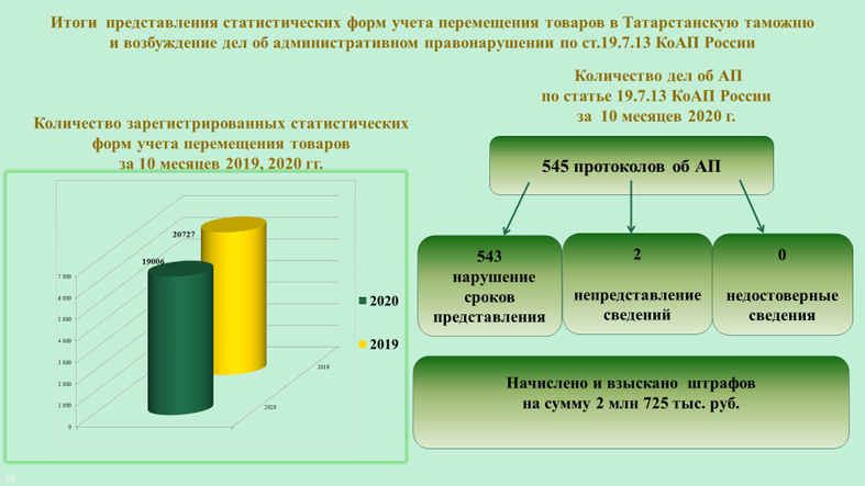 За 10 месяцев 2020 года Татарстанская таможня зарегистрировала 19006 статистических форм учета перемещения товаров. За непредставление и нарушение сроков представления в таможенный орган статформ составлено 545 протоколов об административном правонарушении по статье 19.7.13 КоАП РФ, наложено и взыскано 2 млн 725 тыс. руб. штрафов.