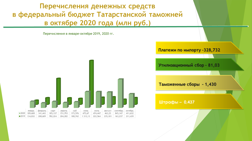 В октябре 2020 года Татарстанская таможня направила в федеральный бюджет 411 млн 632 тыс. руб. Из них платежи по импорту составили 328 млн 732 тыс. руб., таможенные сборы – 1 млн 430 тыс. руб., утилизационные сборы – 81 млн 30 тыс. руб., штрафы – 437 тыс. руб.