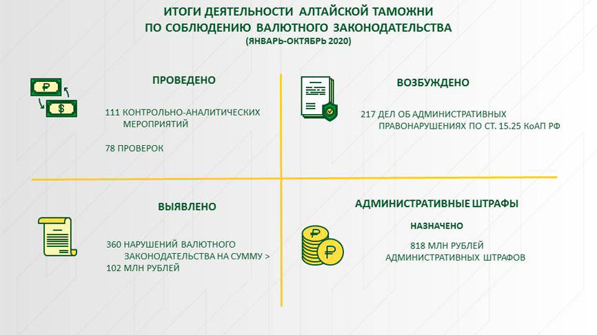 За 9 месяцев 2020 года таможенными органами региона выявлено 69 фактов перемещения наличной иностранной и российской валюты с нарушением таможенных правил, 10 фактов незаконного перемещения ювелирных изделий из золота и серебра. Возбуждено 71 дело об АП и 7 уголовных дел. Предметами правонарушений в частности стали 1,3 млн долларов США, 167,7 тыс. евро, 20,5 млн рублей, 1,38 кг изделий из золота, 5,4 кг изделий из серебра.