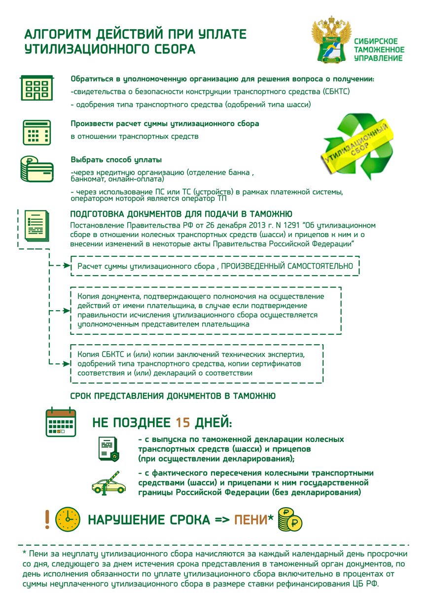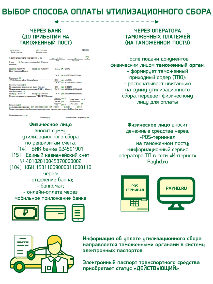 Графика включает схему действий для уплаты в таможню утилизационного сбора физическим лицом, а также содержит следующую информацию: