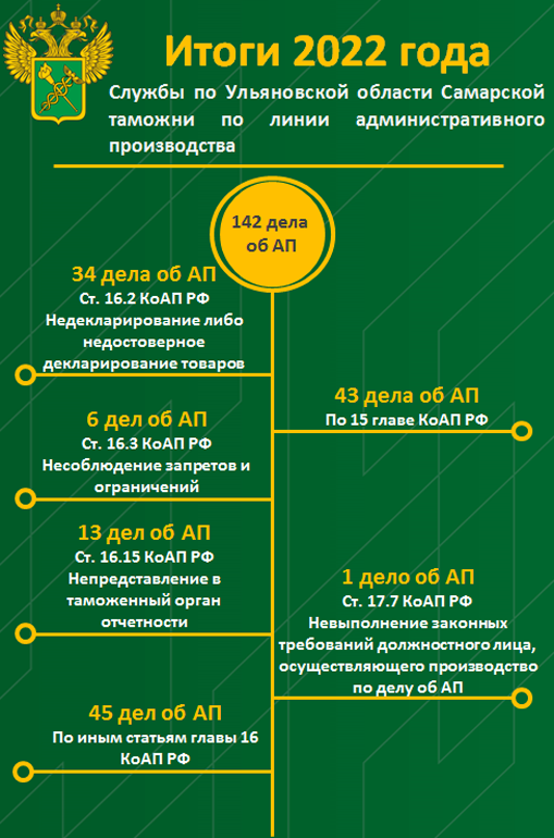 142 дела об административных правонарушениях возбудила служба по Ульяновской области Самарской таможни (по линии административного производства) в 2022 году.