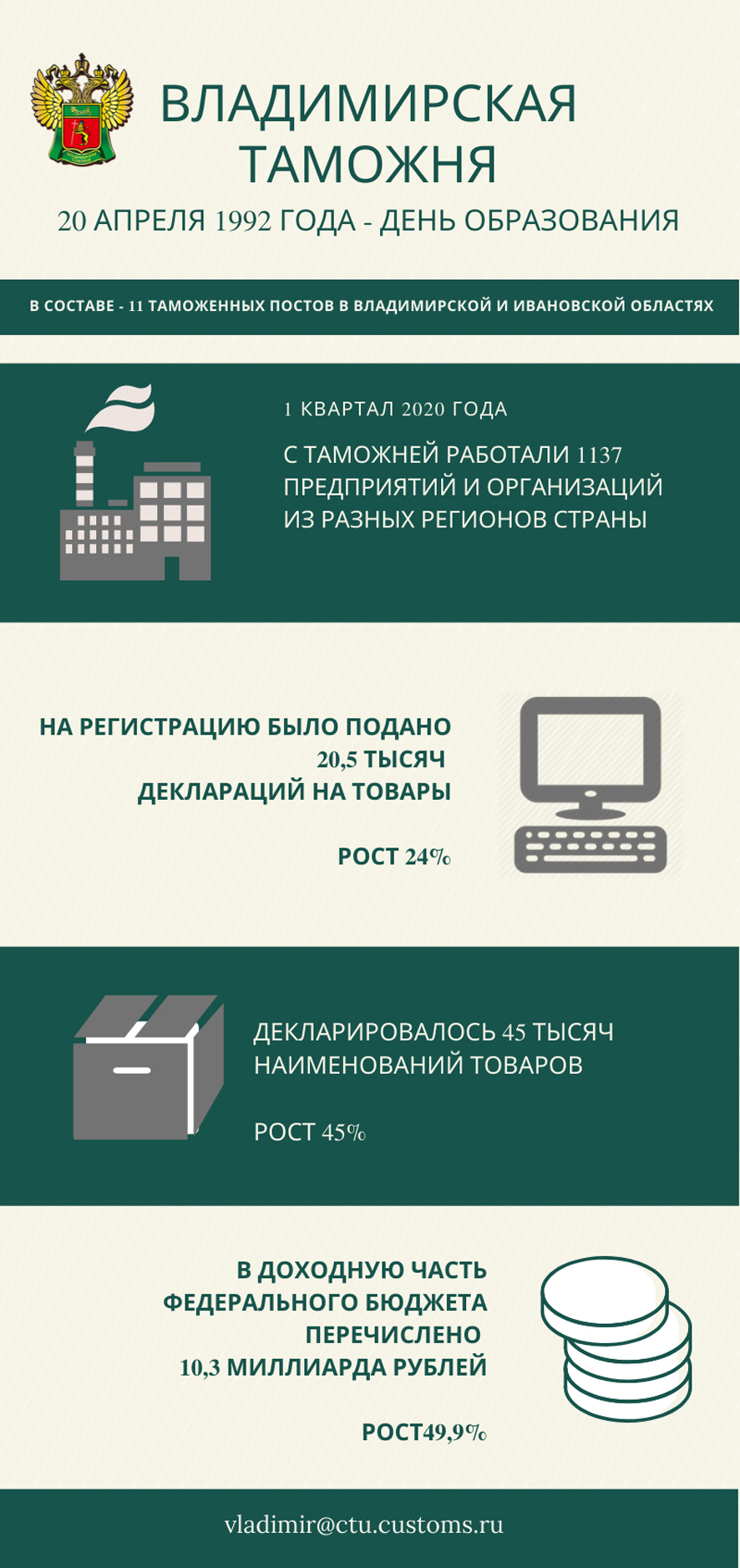 В 1 квартале 2020 года с Владимирской таможней работали 1337 предприятий, организаций и физических лиц (в 2019 – 1002). Из них 18% зарегистрированы во Владимирской области, 13% в Ивановской области, остальные – в иных регионах Российской Федерации. В федеральный бюджет перечислено 10,3 миллиарда рублей, в аналогичном периоде 2019 года - около 7 миллиардов рублей.