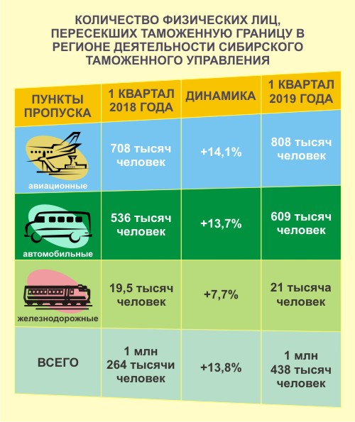 «Рост количества физических лиц, которые пересекли таможенную границу ЕАЭС в Сибирском регионе, характерен для всех видов транспорта. В 1 квартале 2019 года мы зафиксировали увеличение пассажиропотока как в воздушных и автомобильных, так и в железнодорожных пунктах пропуска», - сообщил начальник службы организации таможенного контроля СТУ Вячеслав Селезнёв.