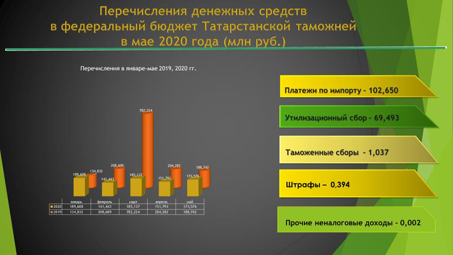 В мае 2020 года Татарстанская таможня направила в федеральный бюджет 173 млн 576 тыс. руб. Из них платежи по импорту составили 102 млн 650 тыс. руб., таможенные сборы – 1млн 37 тыс. руб., утилизационные сборы – 69 млн 493 тыс. руб. штрафы –394 тыс. руб., прочие неналоговые доходы – 2 тыс.руб.