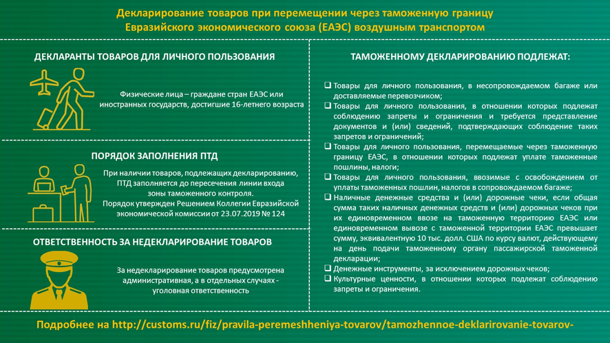 С 1 февраля 2020 года вступило в силу решение Коллегии Евразийской экономической комиссии от 23 июля 2019 года № 124 «О таможенном декларировании товаров для личного пользования». Этим решением утверждена новая форма пассажирской таможенной декларации (ПТД), а также порядок ее заполнения. Он определяет правила заполнения ПТД при таможенном декларировании товаров для личного пользования в виде электронного документа