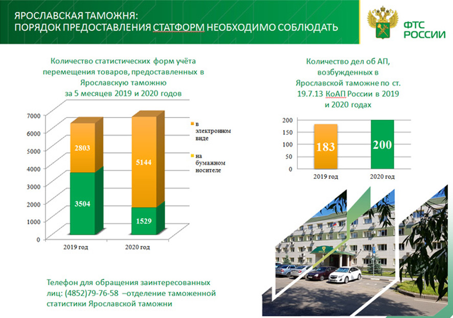 Эта технология позволяет экономить время и ресурсы, снижает риск нарушения установленных Постановлением Правительства сроков представления статформ, что рассматривается как административное правонарушение. Ответственность за такое правонарушение, равно как и за непредставление статистических форм или за указание в них недостоверных сведений, предусматривается статьёй 19.7.13 КоАП России. Особенно строго наказываются случаи повторных нарушений, штрафные санкции могут превышать 50 тысяч рублей за каждое правонарушение. За 5 месяцев 2020 года Ярославской таможней возбуждено 200 административных дел этой категории, начислено административных штрафов на сумму 1 млн. 170 тыс. рублей.