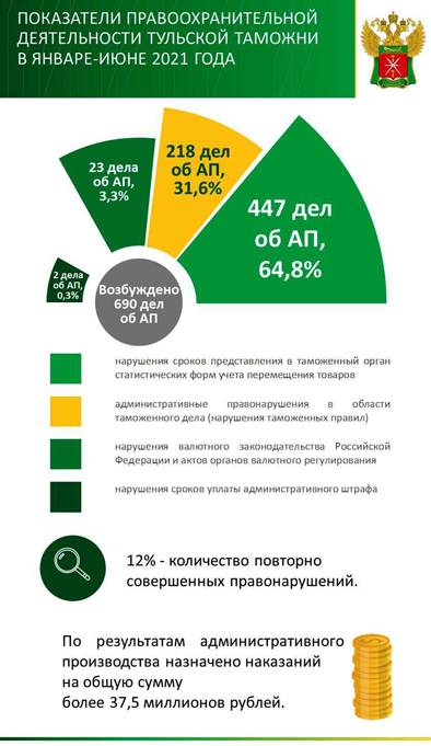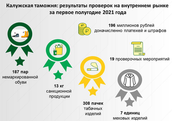 За 5 месяцев 2021 года в федеральный бюджет перечислено по всем видам таможенных платежей более 76,6 млрд рублей. В результате правоохранительной деятельности возбуждено 603 дела об административных правонарушениях и 12 уголовных дел. Установлен факт ввоза 45,6 кг «санкционного» товара, осуществлено 7 приостановлений выпуска товаров, выявлено около 920 тысяч единиц контрафактной продукции. Размер причиненного правообладателю ущерба составил более 71 миллиона рублей.